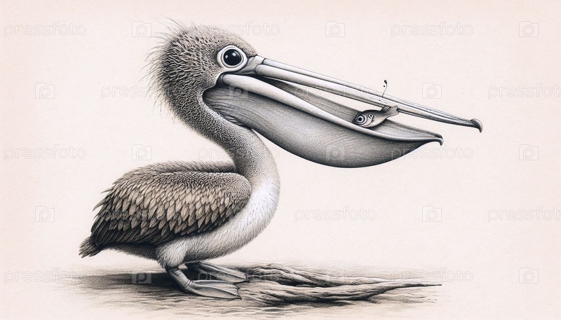 Небольшой пеликан с рыбой в клюве чернилами рисует художественный принт, Ai generated image