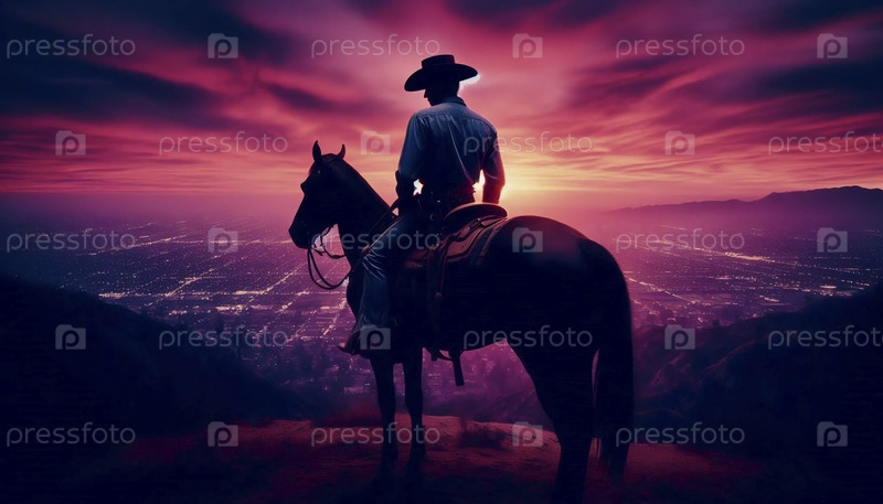 Силуэт одинокого всадника на холивудском закате, Ai generated image