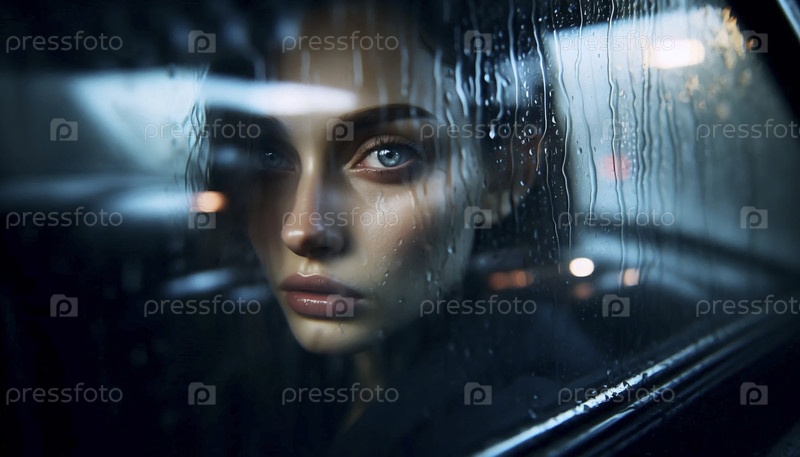Глаза, увиденные через окно с полосками дождя, Ai generated image