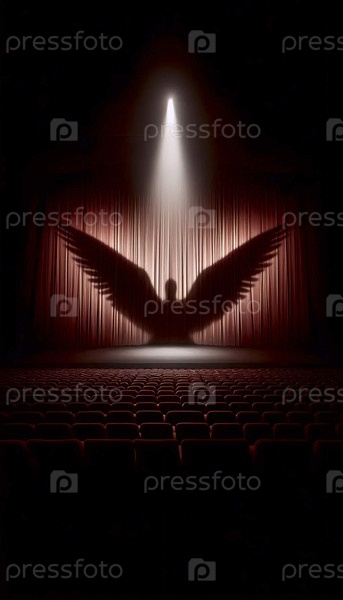 Тени ангельских крыльев на театральном занавесе, без актеров, Ai generated image