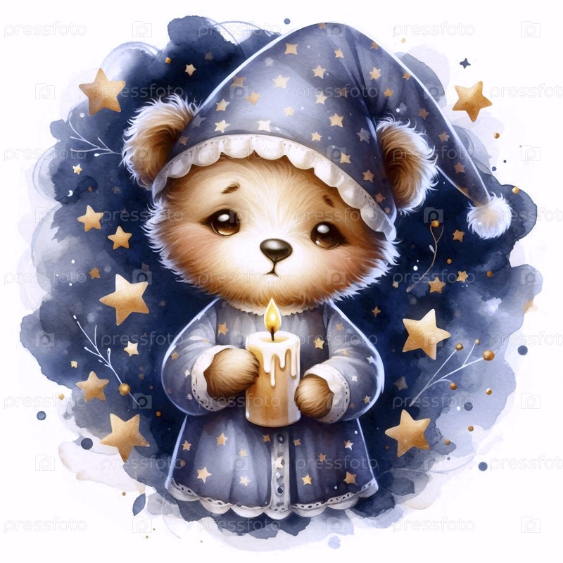 Спящий медведь в звездном ночном халате Акварельная художественная печать, Ai generated image