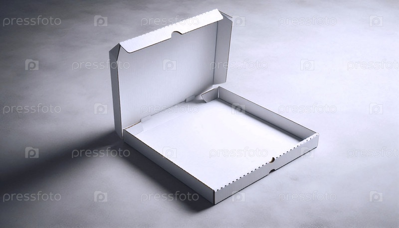 Плоский, развернутый белый макет коробки с пиццей, показывающий внутреннюю пустую поверхность на бетонном полу