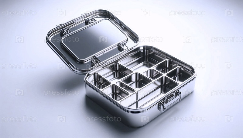 Утонченный, разделенный на отсеки макет обеденной коробки из нержавеющей стали, открытый и пустой, на белой поверхности Ai generated image