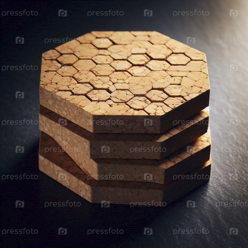 Набор трех шестиугольных макетов пробковых подъездов, наложенных друг на друга на гранитной поверхности, Ai generated image