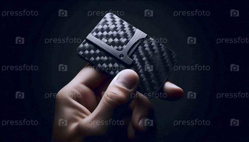Тонкий макет держателя карт из черного углеродного волокна с титановым монетным застежкой, который держится в руке, Ai generated image