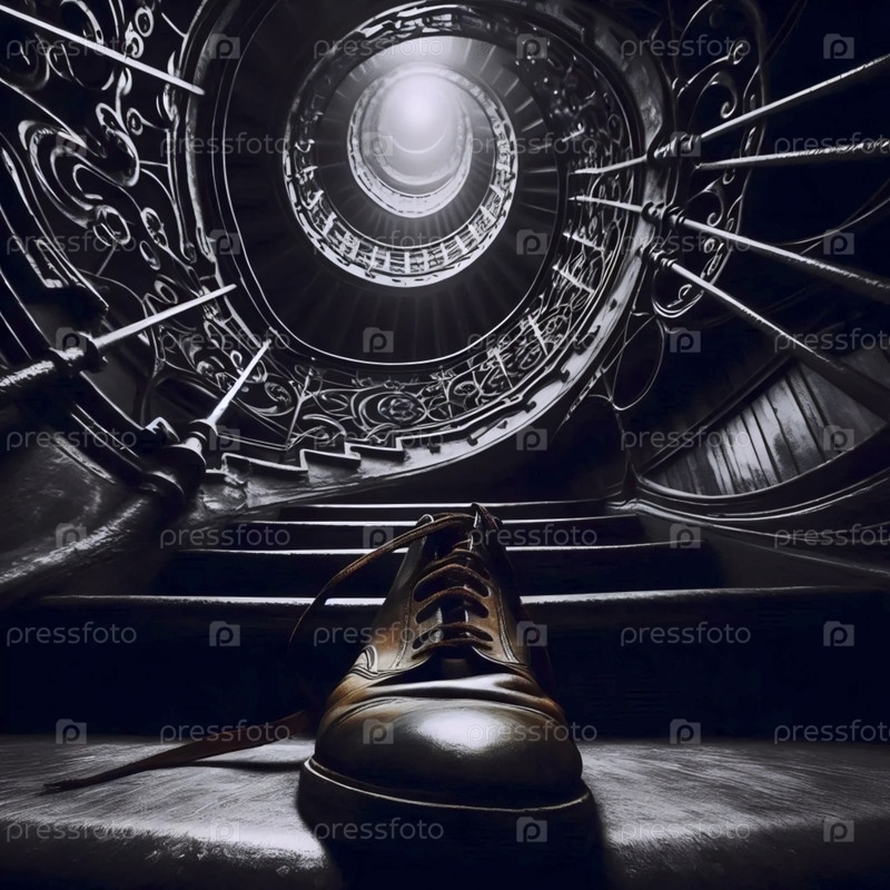 Низкоугольный снимок, смотрящий вверх по лестнице, обувь на переднем плане, Ай создал изображение