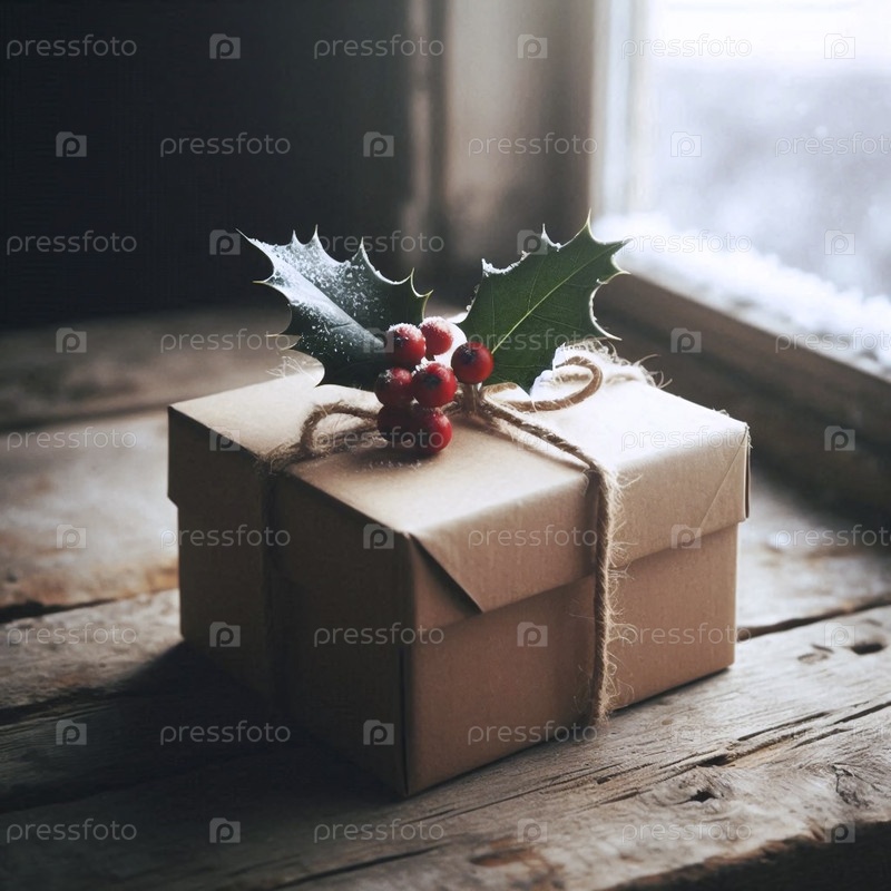 Мокет подарочной коробки из крафт-бумажной бумаги, украшенный веточкой свежей ольхи и ягод на деревянном столе, Ai generated image