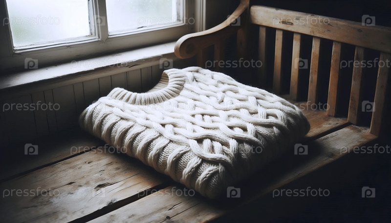 Макет толстого кремового свитера, вязанного из кабеля, сложенный на деревянной дубовой скамейке, Ai generated image