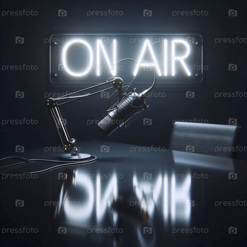 Мокет черного стеклянного стола с микрофоном в пустой руке, под светом пользовательского неонового знака "ON AIR" (выключенный), Ai создал изображение