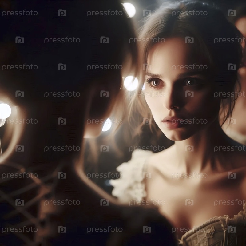 Ближайший снимок отражения: лицо в зеркале, игнорируя зрителя, Ай создал изображение