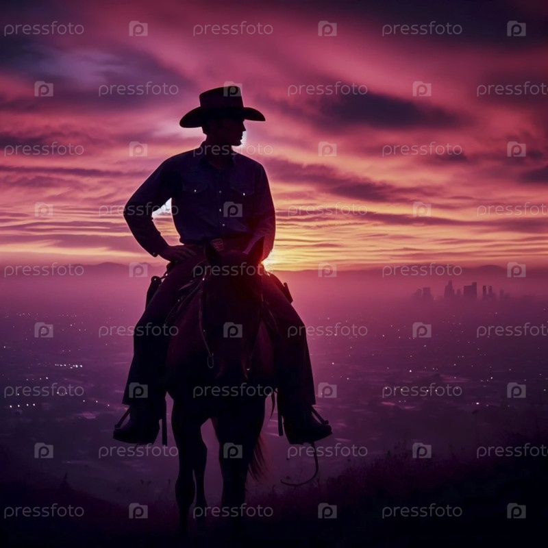 Силуэт одинокого всадника на холивудском закате, Ai generated image