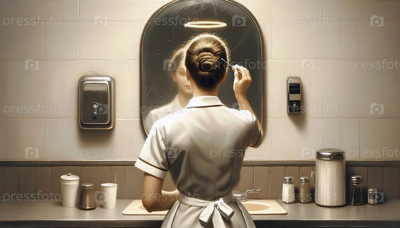 Официантка-ангел, фиксирующая свой ореол как шприц для волос, Ai generated image