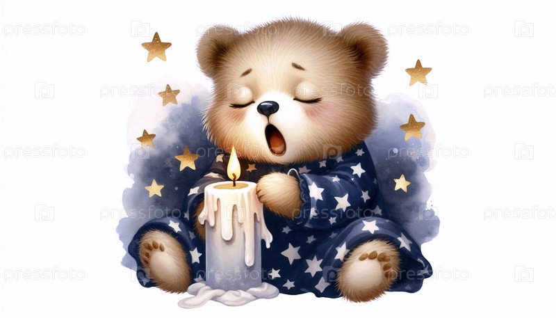 Спящий медведь в звездном ночном халате Акварельная художественная печать, Ai generated image