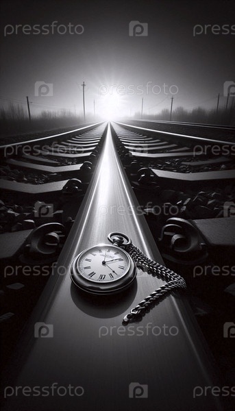 Карманные часы на цепи, оставленные на железнодорожных путях, Ai generated image