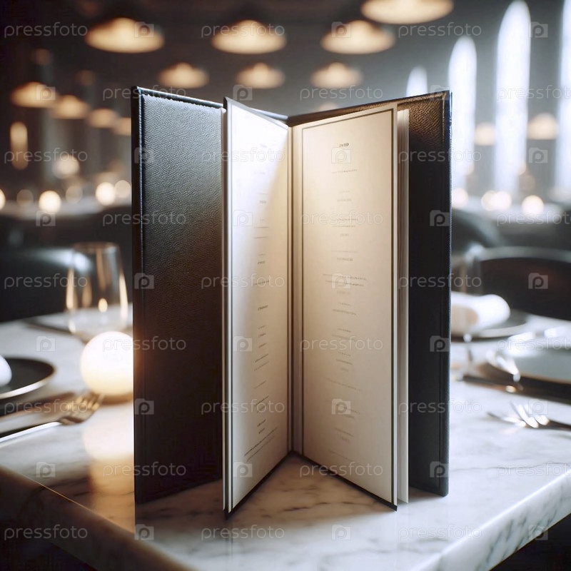 Пустой макет меню ресторана, покрытый кожей, открыт на мраморной столовой поверхности, Ai generated image