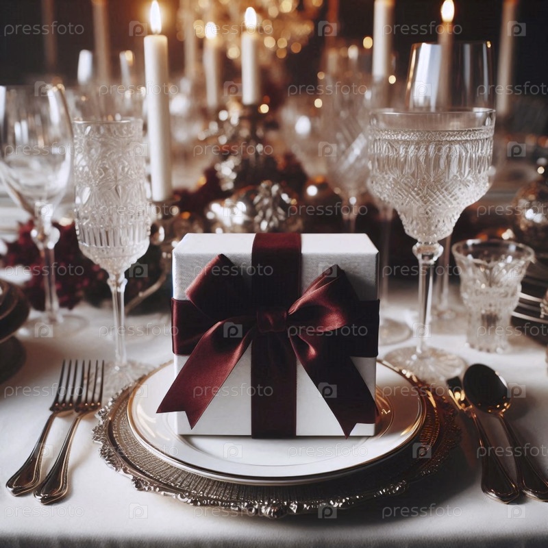Простой белый макет подарочной коробки с широкой меховой лентой, расположенной посреди богато установленного праздничного обеденного стола перед прибытием гостей, Ai generated image