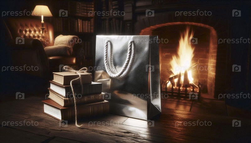 Мокет глянцевой серебряной подарочной сумки, опираясь на кучу старинных книг у трескающегося камина, Ai generated image