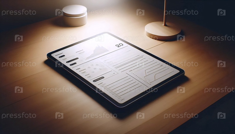 Макет планшета, лежащего плоско, отображающий пустую приборную панель с сетчатыми линиями на деревянном столе, Ai generated image
