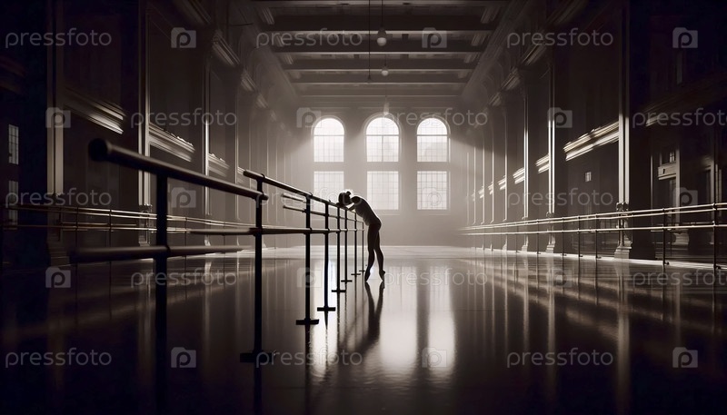 Более широкий снимок пустой студии, танцор опирающийся на бар, отражение небольших деталей, Ай создал изображение