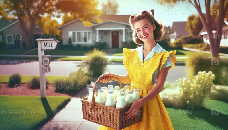 Молочница 1950-х годов в ярком платье с фартуком, Ai generated image