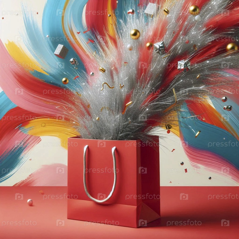 Простой бумажный макет подарочной сумки, переполненный нитями серебряного и золотого тинзеля на красочном абстрактном фоне, Ai создал изображение