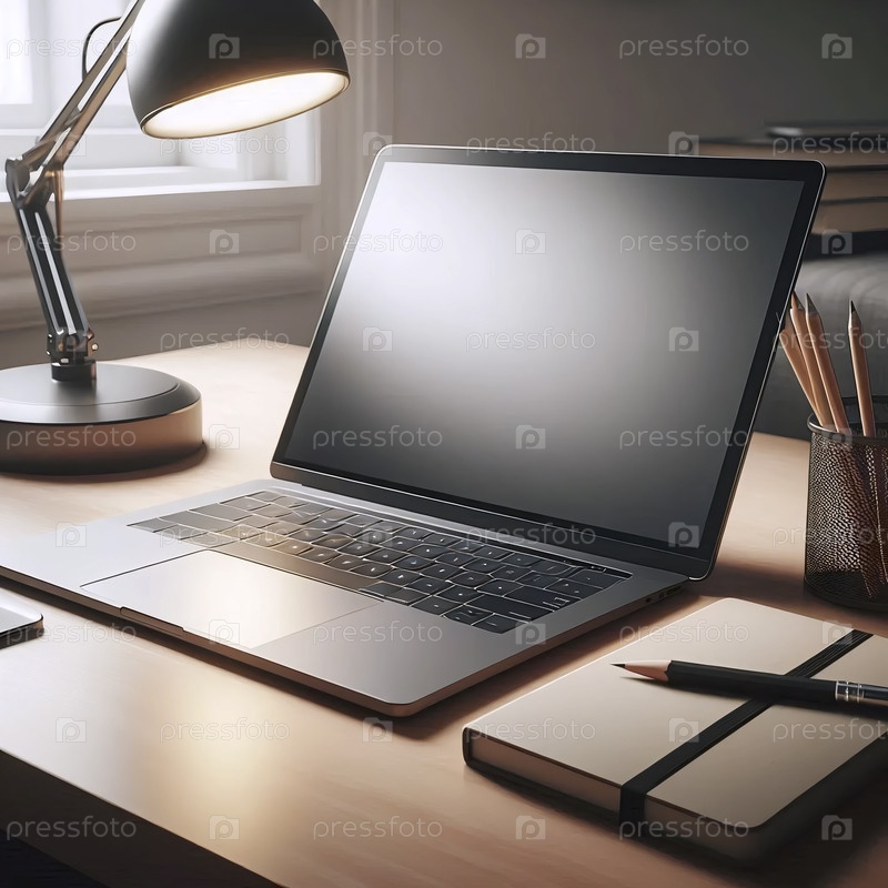 Мокет ноутбука с открытым пустым экраном на деревянном столе рядом с блокнотом, Ai generated image