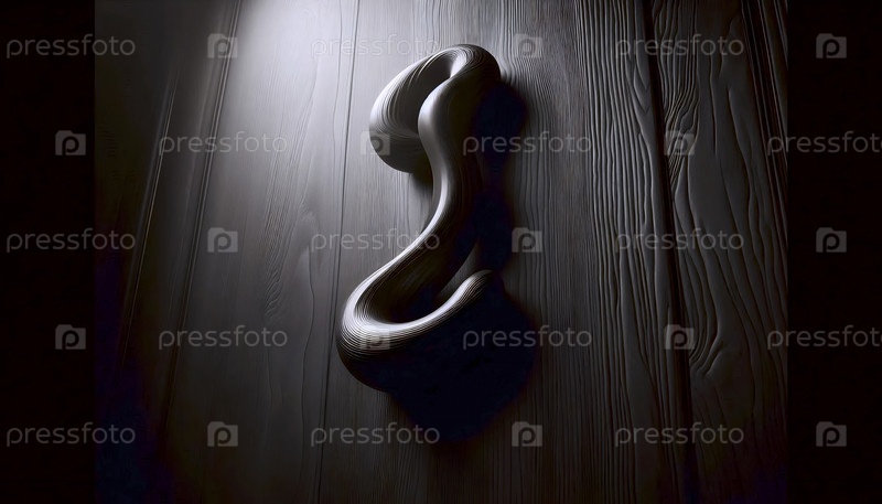 Тяжелый, литый бронзовый макет дверной ручки, установленный на двери от пола до потолка из выдыхаемого черного дуба с освещением со стороны соседней комнаты