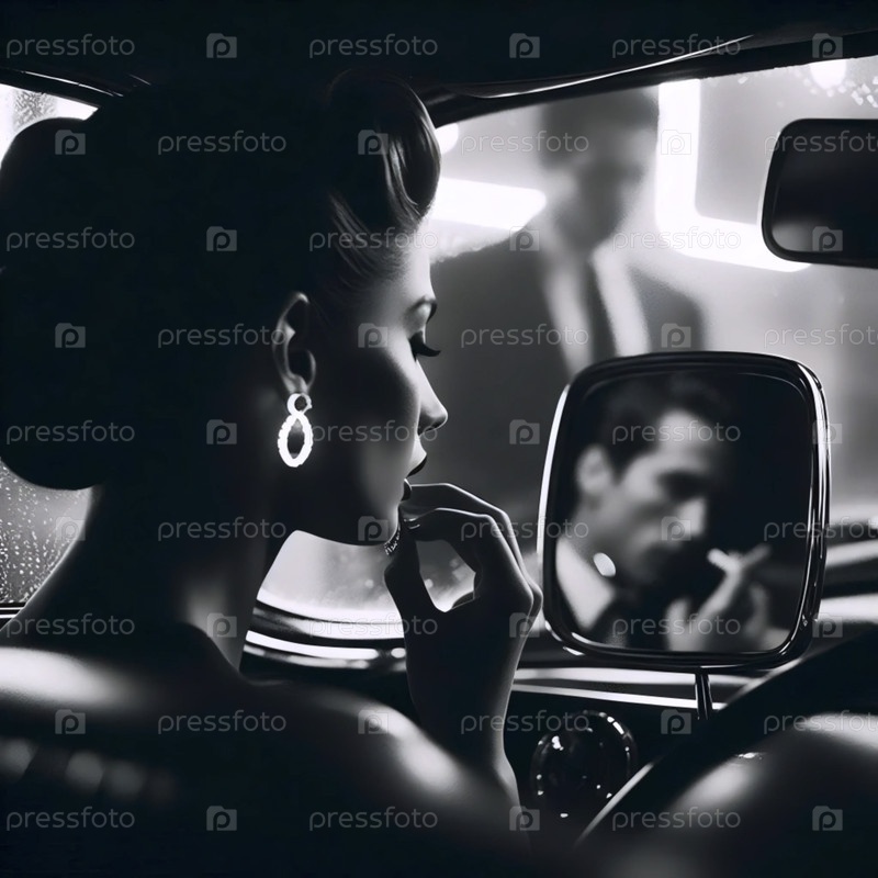 Девушка корректирует серьги в зеркале автомобиля, Ai generated image
