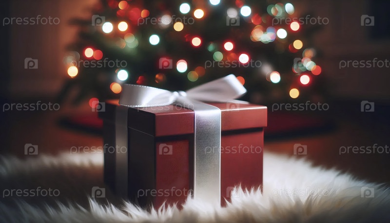 Матово-красный макет подарочной коробки с белой атласной лентой, развязанной и положенной под мерцающими огнями рождественской елки, Ai создал изображение