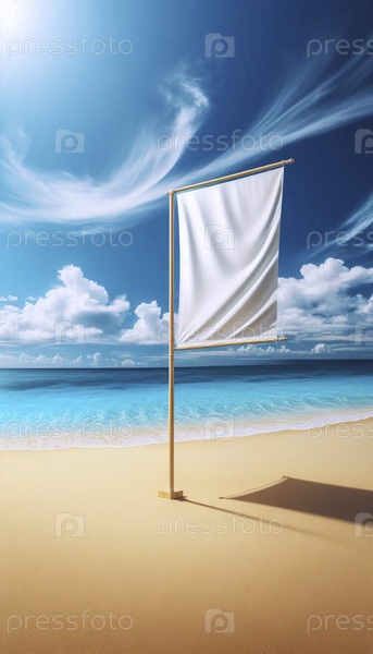 Большой самостоятельный макет баннера флага на песчаном пляже, белая ткань которого слегка размахивает против чистого синего неба и океана, Ai создал изображение
