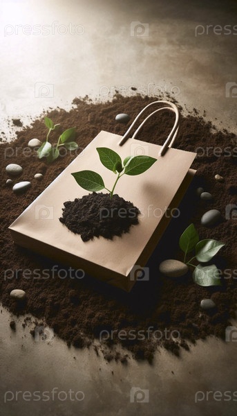 Макет плоского, переработанного бумажного торгового пакета с простым саженцем, растущим в углу на почвенном поле, Ai создал изображение