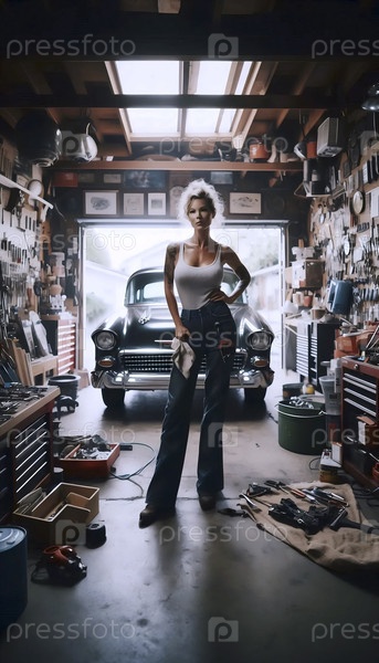 Широкий снимок механика в ее гаражном королевстве, Ай создал изображение