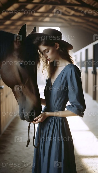 Женщина тренирует лошадь в джинсовом платье, Ai generated image