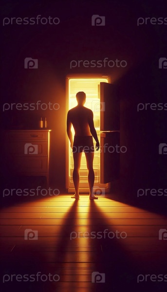 Силуэт перед открытым холодильником ночью, Ai generated image