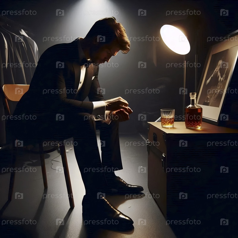 Мужчина в смокинге за кулисами корректирует свои наручники, Ai generated image