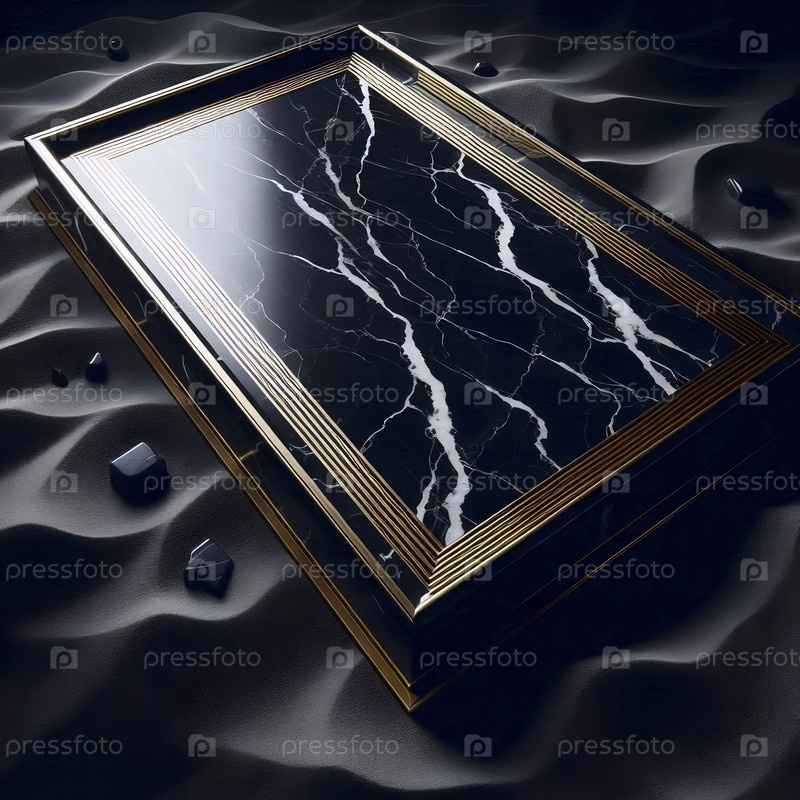 Большой прямоугольный макет подноса, вырезанный из черного мрамора с тонкими инкрустированными золотыми линиями, изолированный на кровати из чёрного песка, Ai создал изображение