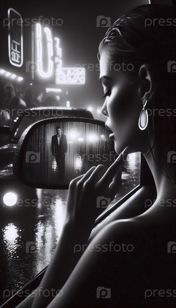 Девушка корректирует серьги в зеркале автомобиля, Ai generated image