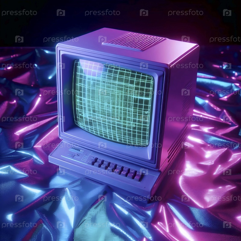Транслюцентно-фиолетовый макет монитора CRT, отображающий сетку на серебряной голографической поверхности