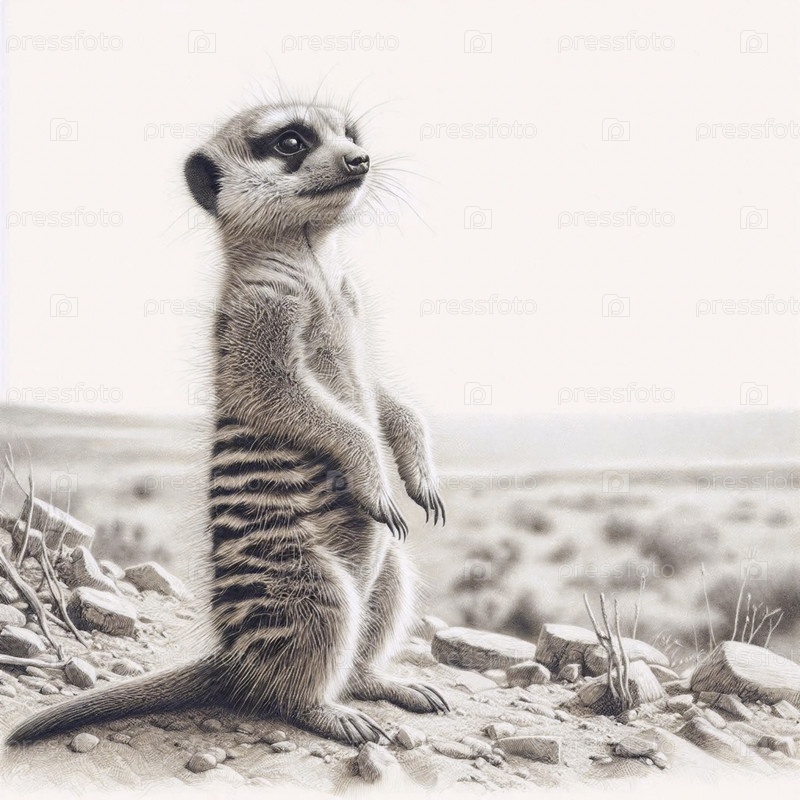 Щенок-сурикат стоящий охранник чернила рисование художественная печать, Ai generated image