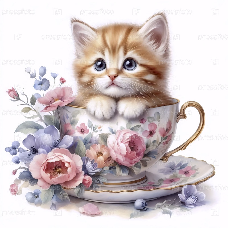 Котенок в чайной чашке Акварельная художественная печать, Ai generated image