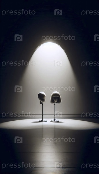 На более широком снимке, показывающем парики на их стойках в пустой комнате, Ай создал изображение