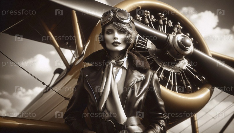 Авиатрица 1930-х годов на своем биплане, Ai generated image