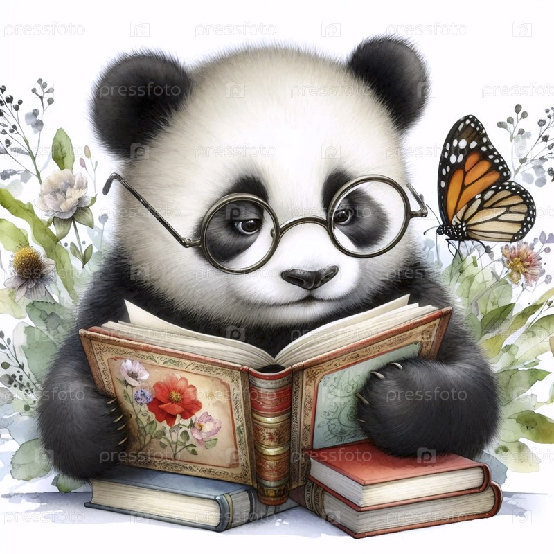 Панда читает сказку перед сном акварельный арт-принт, Ai generated image