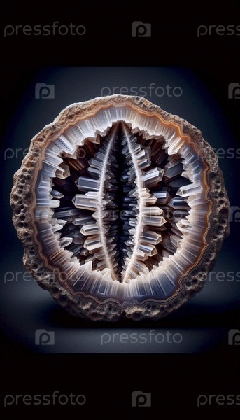 Макромокет слайса геоды, показывающий простую внешнюю кору и захватывающую дух пустую полость, облицованную кристаллическими структурами