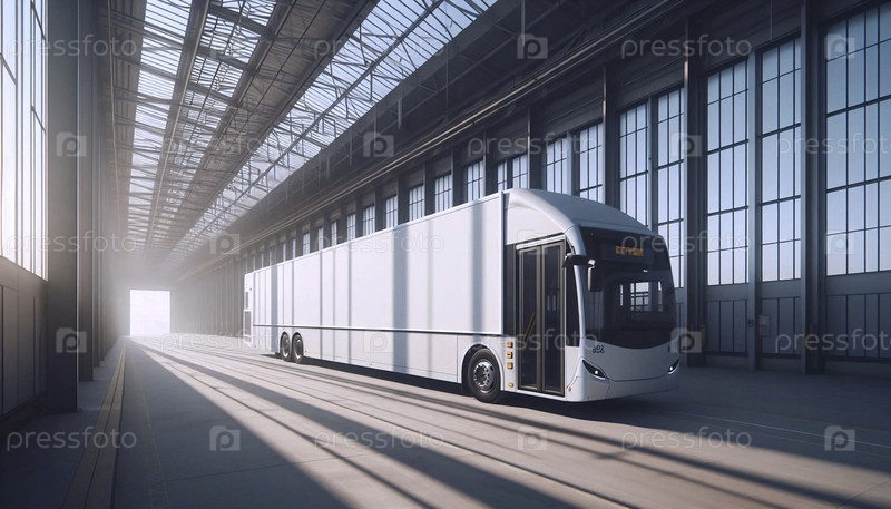 Мокет рекламы автобуса со всей стороны, показывающий совершенно пустую белую обертку на стационарном автобусе в депо, Ai generated image