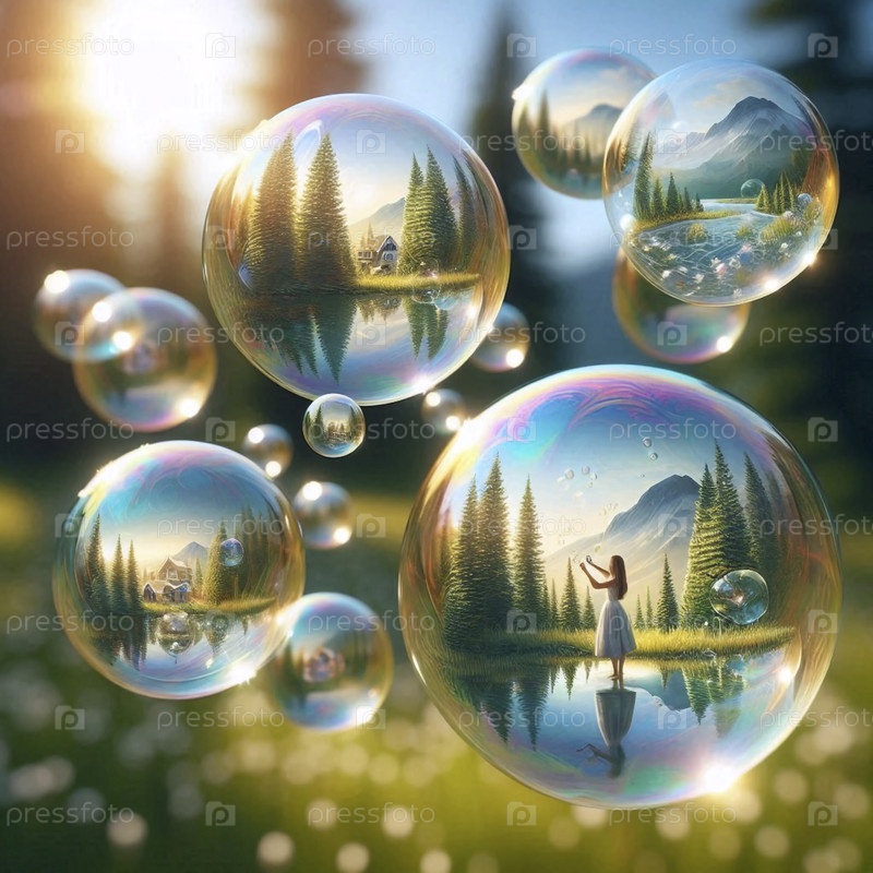 Мыльные пузыри, содержащие пейзажи акварели, Ai generated image