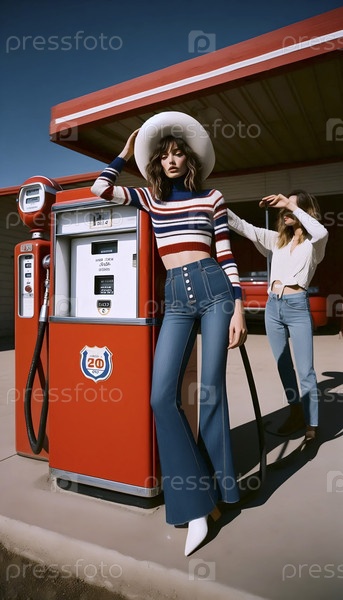 Модные съемки на старинной заправочной станции, Ai generated image