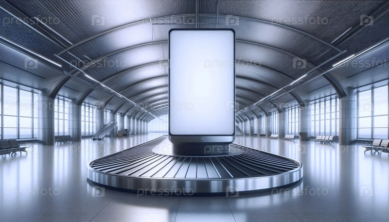 Выгнутый панорамный рекламный макет-панел расположен над пустой багажной каруселью аэропорта, Ai generated image