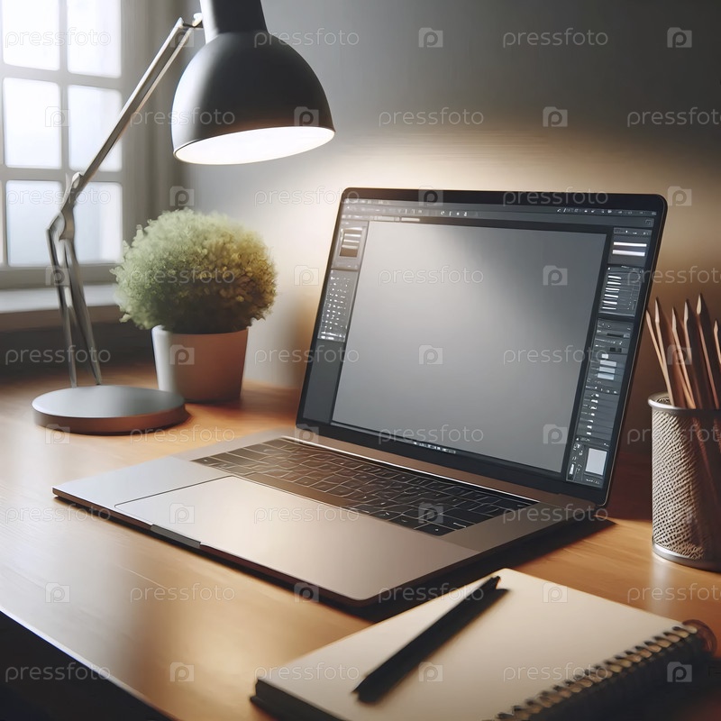 Мокет ноутбука с открытым пустым экраном на деревянном столе рядом с блокнотом, Ai generated image