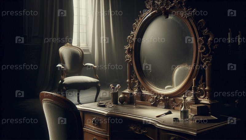 Более широкий снимок, включающий пыльное зеркало, отражающее пустой стул, Ai generated image